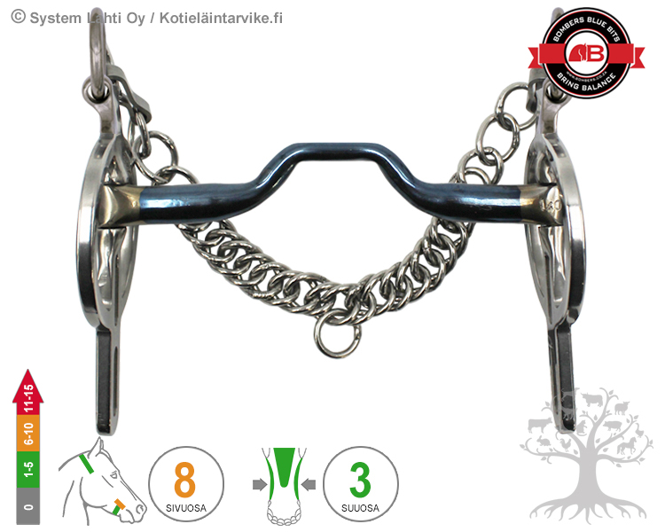 SIVUOSA - Liverpool LR on kiinteä vipuvarrellinen valjakko ajokuolain, jonka suuosa ja sivuosa on kiinteästi yhdessä, mutta kuolaimen vipuvarsi pääsee kääntymään (Rotate) ”pystysuuntaisesti” ohjasapujen suuntaisesti/mukaisesti. Poskihihnoihin kiinnitettävät ylärenkaat pääsevät pyörimään täysin vapaasti (LR = Loose Ring), jolla on haluttu vähentää niskaan ja leukaan kohdistuvaa painetta. Kuolaimen vipuvaikutus niskaan ja alaleukaan määräytyy sen mukaan, mihin ohjaspaikkoihin (A-C/D) ohjat kiinnitetään, isoimmissa renkaissa (A) kuolaimen vipuvaikutus on pehmein ja alimmissa renkaissa (C/D) voimakkain. Kuolaimen vipuvarsi asettuu tasaisesti hevosen suupieliä/poskia vasten ja antaa vakaan kuolaintuntuman hevosen suuhun ja lisää sivuttaissuuntaista (cheek) ohjaavaa vaikutusta. Leukaketju säädetään niin, että kuolaimen vipukulma on noin 45 asteen kulmassa (älä kiristä leukaketjua liian tiukalle). Kuolaimessa on mukana ruostumattomasta teräksestä valmistetut leukaketju ja -ketjun kiinnityskoukut. Saatavana kahta eri varren pituutta: Short 2 -ohjaspaikkaa (B-C) ja Long 3-ohjaspaikkaa (B-D). Ajokuolain tulisi mitoittaa hevoselle mahdollisimman napakasti/stabiilisti, ettei kuolaimen suuosa pääsisi liikkumaan sivuttaissuuntaisesti.