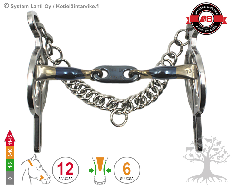 Bombers Liverpool Rotate Control Plate 45°. Control Plate 45° kuolaimessa on litteä/laattamainen "plate" ja 45mm pitkä keskipala, joka on suuosassa kiinni kielensuuntaisesti 45° kulmassa. Kuolaintuntumalla kuolain on vaikutuksiltaan pehmeä antaen tilaa hevosen kielelle ja jakaen kuolaimen aiheuttaman paineen tasaisesti laajemmalle alueelle. Jos hevonen laskee päätään/leukaa liian alas tai liian ylös, niin kuolaimen laattamainen keskipala “kääntyy” ja aiheuttaa painetta hevosen kielelle ohjaten sitä takaisin kuolaintuntumalle. Control Plate on ns. “kontrollikuolain", joka parantaa hevosen hallittavuutta ja ohjaa hevosta laskemaan päätä ja tuomaan leukaa kohti rintaan päin. Kuolaimen suuosa on valmistettu Bombersin kehittämästä, ainutlaatuisesta ja erittäin hyvin sylkeä stimuloivasta makeasta raudasta eli "Sweet Iron" -metalliseoksesta. Erittäin suosittu kuolain!