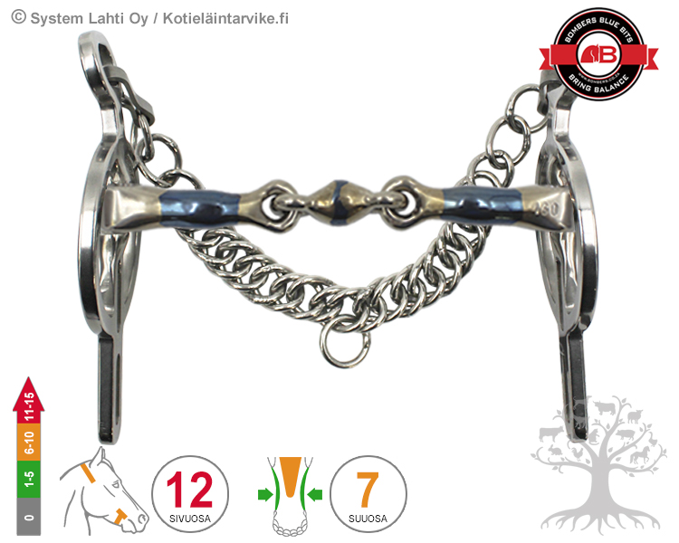 SIVUOSA - Liverpool Rotate on kiinteä vipuvarrellinen valjakko ajokuolain, jonka suuosa ja sivuosa on kiinteästi yhdessä, mutta kuolaimen vipuvarsi pääsee kääntymään (Rotates) ”vaakasuuntaisesti” ohjasapujen suuntaisesti/mukaisesti. Ylimmistä ulospäin taivutetuista varsirenkaista kuolain kiinnitetään poskihihnoihin. Kuolaimen vipuvarsi aiheuttaa keskikovaa painetta poskiin (cheek), niskaan (poll) ja alaleukaan (curb). Kuolaimen vipuvaikutus niskaan ja alaleukaan määräytyy sen mukaan, mihin ohjaspaikkoihin (A-C/D) ohjat kiinnitetään, isoimmissa renkaissa (A) kuolaimen vipuvaikutus on pehmein ja alimmissa renkaissa (C/D) voimakkain. Kuolaimen vipuvarsi asettuu tasaisesti hevosen suupieliä/poskia vasten ja antaa vakaan kuolaintuntuman hevosen suuhun ja lisää sivuttaissuuntaista (cheek) ohjaavaa vaikutusta. Leukaketju säädetään niin, että kuolaimen vipukulma on noin 45 asteen kulmassa (älä kiristä leukaketjua liian tiukalle). Kuolaimessa on mukana ruostumattomasta teräksestä valmistetut leukaketju ja -ketjun kiinnityskoukut. Saatavana kahta eri varren pituutta: Short 2 -ohjaspaikkaa (B-C) ja Long 3-ohjaspaikkaa (B-D). Ajokuolain tulisi mitoittaa hevoselle mahdollisimman napakasti/stabiilisti, ettei kuolaimen suuosa pääsisi liikkumaan sivuttaissuuntaisesti.