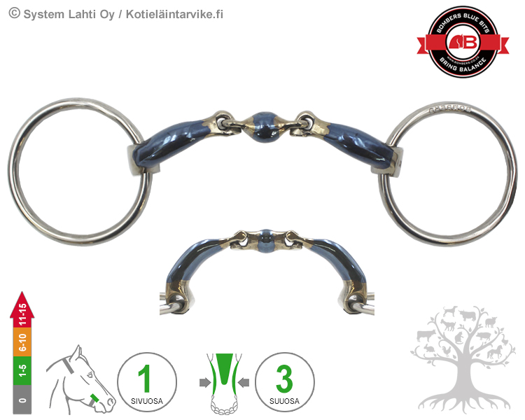 Bombers Loose Ring Elliptical Ultra Comfy Lock Up. Elliptical Ultra Comfy Lock Up on uusi innovatiivinen ja uniikki kahteen suuntaan (eteen- ja ylöspäin) lukittuva 3-palakuolain, jolla on hevosta kuolaintuntumalle erittäin rohkaiseva ja palkitseva vaikutus. Tämä anatomisesti huippuunsa suunniteltu ja muotoiltu kuolain myötäilee hevosen suun muotoja lähes “täydellisesti” ja jakaen kieleen ja hammaslomaan kohdistuvan paineen erittäin tasaisesti. Keskiosaan päin nousevat sivunivelet (kielentilamuotoilu) antavat hyvin tilaa myös kielelle, joten kuolain sopii myös kielestään herkille hevosille. Kahteen suuntaan lukittuva 3-palakuolain estää kuolainta aiheuttamasta hevosen kitalakeen kohdistuvaa pistemäistä painetta sekä hammaslomiin kohdistuvaa puristusta eli ns. pähkinänsärkijäefektiä.