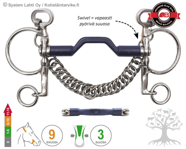 Bombers Pelham Swivel Bomber Blue. Bomber Blue on uniikki kielentilallinen kuolain, joka valmistettu ainutlaatuisesta, kevyestä ja lämpimän tuntuisesta sekä erittäin hyvin sylkeä/limaa stimuloivasta nailonkomposiitista (sisällä on teräsvahvike). Kuolaimen ainutlaatuinen materiaali sopii erityisesti hevosille, jotka vastustavat metallista valmistettuja kuolaimia mm. pelaamalla kuolaimella ja/tai olemalla suustaan hyvin levottomia. Bomber Blue sopii hämmästyttävän hyvin erityyppisille hevosille lajista riippumatta. Kuolaimissa on mukana Bombersille tunnusomaiset oranssit väriset kuolaintutit, jotka voi halutessaan ottaa pois.