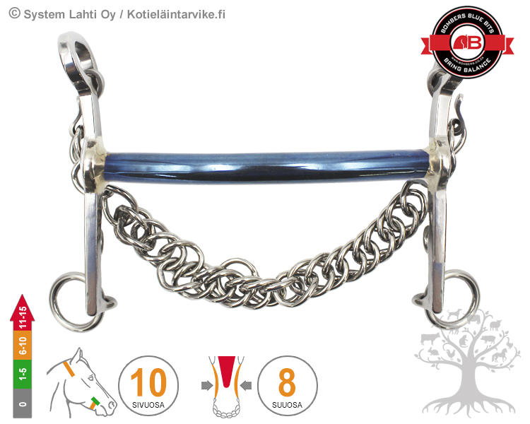 SIVUOSA - Weymouth, Kankikuolainta käytetään kankisuitsituksessa yhdessä bridong -kuolaimen kanssa. Bombersin kankikuolaimet on erittäin korkealaatuisia, tyylikkäitä ja kevyitä sekä anatomisesti muotoiltuja. Kangen alavarsi muuttaa ohjastuntuman mukaan aiheuttaen painetta kuolaimen suuosaan ja keskikovaa painetta hevosen niskaan (poll) ja alaleukaan (curb). Pitkässä 75mm alavarressa on enemmän vipuvaikutusta kuin lyhyessä 55mm alavarressa. Kankikuolaimen vipuvarsi asettuu tasaisesti hevosen suupieliä/poskia vasten ja antaa vakaan kuolaintuntuman hevosen suuhun ja lisää sivuttaissuuntaista (cheek) ohjaavaa vaikutusta.