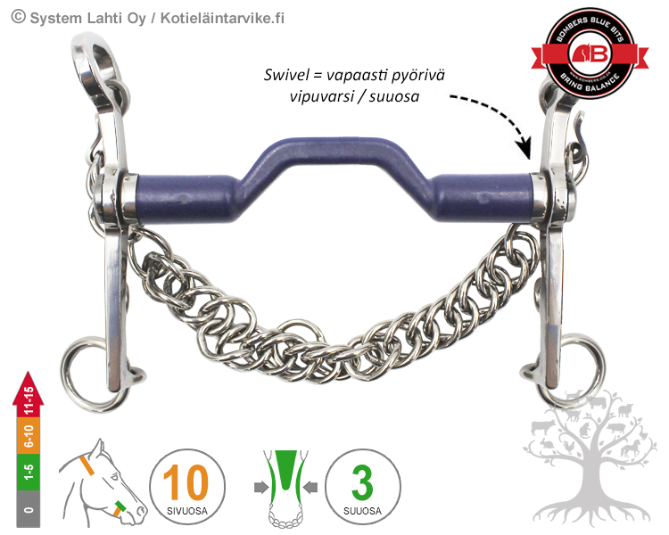 SIVUOSA - Weymouth Swivel on uusi innovatiivinen kankikuolain, jossa on vapaasti pyörivät vipuvarret/suuosa. Vapaasti pyörivä ja ”itsenäinen” suuosa asettuu hevosen suuhun lähes paineettomasti, suuta myötäillen, joten hevosen on helpompi hyväksyä kuolaintuntuma suussaan. Lisäksi kangen vipuvarret kääntyvät itsenäisesti/toisistaan riippumattomasti ohjastuntuman mukaan, mikä tekee kangesta tavanomaista "liikkuvamman". Swivel -vapaasti pyörivät/kääntyvät vipuvarret palkitsee hevosta välittömästi, kun se vastaa haluttuun pidätteeseen ja/tai kääntöapuun. Kangen vipuvarret asettuu tasaisesti hevosen suupieliä/poskia vasten ja antaa vakaan kuolaintuntuman sekä ehkäisee kuolainrengasta nipistämästä hevosen suupieliä. Kuolain tulisi mitoittaa hevoselle mahdollisimman napakasti/stabiilisti, ettei kuolaimen suuosa pääsisi liikkumaan sivuttaissuuntaisesti. Weymouth Swivel- kankikuolaimella on saatu hämmästyttävän hyviä tuloksia etenkin hevosilla, joilla on ollut vaikeuksia hyväksyä kankikuolaintuntumaa.