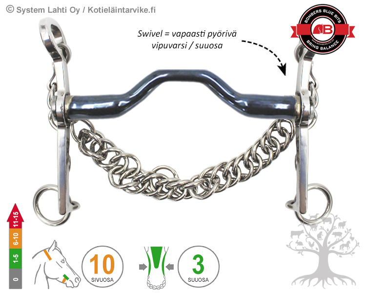 Bombers Weymouth Swivel Happy Tongue Straight. Happy Tongue Straight on yksiosainen ja suoralinjainen kielentilallinen kuolain, joka on litistetty ja muotoiltu keskiosastaan niin, että se myötäilee hevosen suuta lähes “täydellisesti” sekä minimoi kieleen ja kitalakeen kohdistuvaa painetta. Kuolaimen muotoilu jakaa kuolaimen aiheuttaman paineen laajemmalle alueelle ollen vaikutuksiltaan hevoselle erittäin pehmeä. Useimmat hevoset hyväksyvät paremmin anatomisesti muotoiltuja kuolaimia, joissa paine jakautuu tasaisesti koko suun alueelle. Ratsastaja voi kommunikoida hevosen kanssa hyvinkin hienovaraisella tavalla, kun hevonen hyväksyy kuolaimen vaikutukset ja “suutuntuman” sekä ratsastajan ohjasavut.