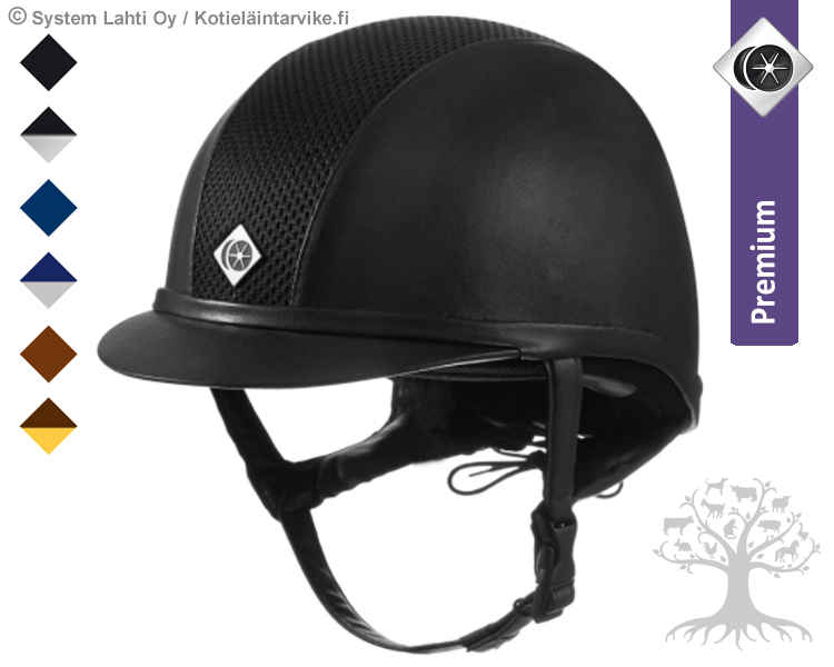 Charles Owen Ratsastuskypärä Ayr8 Plus Leather Look. Erittäin laadukas, turvallinen ja tyylikäs Leather Look -pintainen ratsastuskypärä, joka on yksi suosituimmista Charles Owenin kypärämalleista. Ayr8 Plus -kypärän keskiosassa on 12:sta ilmanvaihtokanavaa edestä taakse, jotka takaavat hyvän ilmanvaihdon ja erinomaisen käyttömukavuuden. Kypärän pintakangas on tyylikästä ja helppohoitoista keinonahkaa. Lisäksi kypärässä on antibakteerinen (hopealanka), irrotettava ja pestävä sisävuori, jonka voi tarvittaessa vaihtaa kokonaan uuteen.