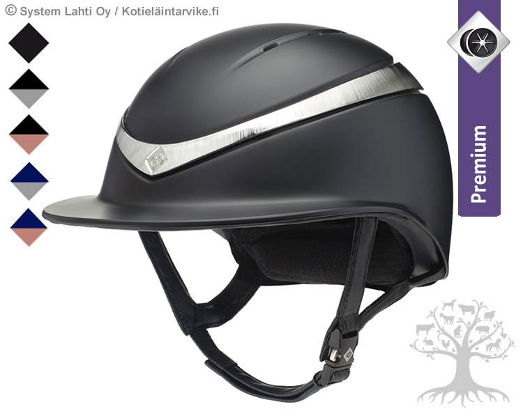 Charles Owen Ratsastuskypärä Halo Luxe. Owenin uutuus Halo Luxe -kypärämallissa on täysin uudenlainen muotoilu ja erittäin tyylikäs moderni ulkonäkö sekä suoralinjainen ja leveä Wide Peak Flexzone -aurinkolippa. Leveä aurinkolippa tekee kypärästä todella näyttävän näköisen ja se suojaa erinomaisesti UV-säteilyltä sekä auringon häikäiseviltä valonsäteiltä.