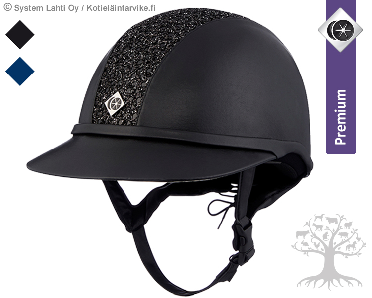 Charles Owen Ratsastuskypärä SP8 Plus Sparkly Leather Look. Erittäin laadukas, turvallinen ja tyylikäs Leather Look (keinonahka) -pintainen ratsastuskypärä suurella Sun Protection lipalla ja erittäin kauniisti kimaltelevalla Sparkly -koristeglitterillä. Suuri aurinkolippa tekee kypärästä todella näyttävän näköisen ja se suojaa erinomaisesti UV-säteilyltä sekä auringon häikäiseviltä valonsäteiltä.