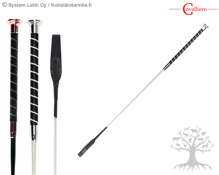 Covalliero Esteraippa Jumping Whip Crystal. Tyylikäs koristekristallein koristeltu esteraippa, jossa on pehmeä keinonahkainen kädensija. Raippa on valmistettu lasikuidusta, joka on päällystetty kestävällä nailonilla. Raipan kädensijan päässä on hopean tai ruusukullanvärinen nuppi ja toisessa päässä "nahkaläppä".