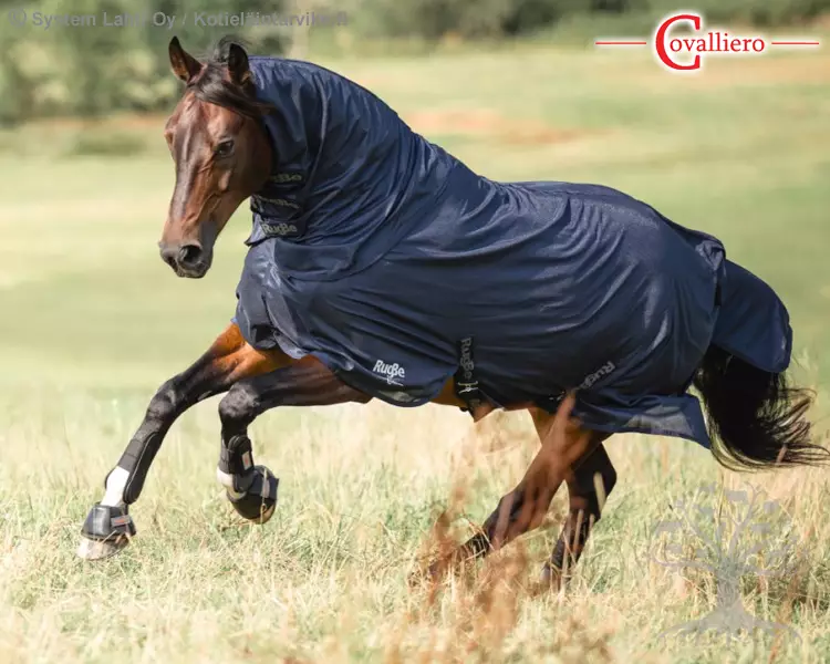 Erittäin hengittävää materiaalia. Loimen etuosassa on nylonvuorellinen pehmuste, joka suojaa hevosta hiertymiltä. Kaulakappaleessa tarranauhakiinnitys. Etuosassa solki- sekä tarranauhakiinnitys. Lisäksi ristivyöt sekä joustavat jalkalenkit. Konepestävä, 30 °C.