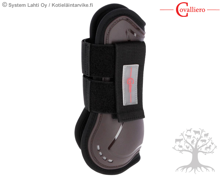Covalliero Jännesuojat TecAir Brown. Tyylikkäät ja kevyet anatomisesti muotoillut jännesuojat hevoselle. Suojan sisäpinta on pehmeää neopreenia, joka on helppo pitää puhtaana. Lycra-reunat tekevät suojien reunoista mukavan pehmeät ja joustavat. Jännesuojat tukevat hevosen etujalan jänteitä ja suojaavat koviltakin iskuilta. Suojissa on pitävä ja joustava tarranauha kiinnitys. Suojat ovat todella hyvin ilmastoidut, suojan molemmin puolin useita ilmanvaihtoreikiä.