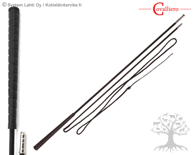 Covalliero Juoksutusraippa 2-osainen. 2-osainen juoksutusraippa, jossa on erittäin pitävä kuminen kädensija. Juoksutusraipan varsiosat kiinnitetään kätevästi ruuvaten kiinni toisiinsa, joten sitä on helpompi kuljettaa ja säilyttää. Raippa on valmistettu lasikuidusta, joka on päällystetty kestävällä nailonilla. Raipan päässä on solmullinen "narusiima".