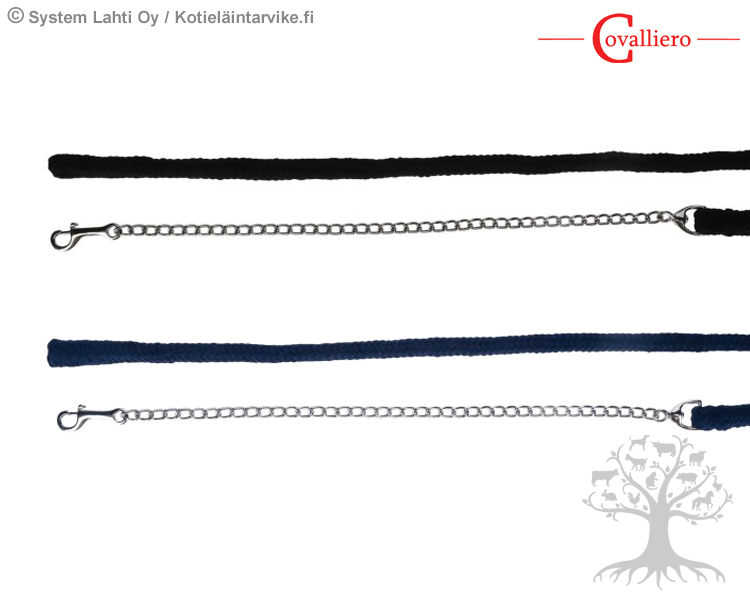 Covalliero Ketju Riimunnaru Cotton. Laadukas ja pehmeä perusmallinen riimunnaru ketjulla. Puuvillasta valmistetun riimunnarun kokonaispituus on noin 2 m, josta ketjuosan pituus on noin 70 cm. Riimunnarun moninkertainen punonta tekee riimunnarusta pehmeän ja mukavantuntuisen.