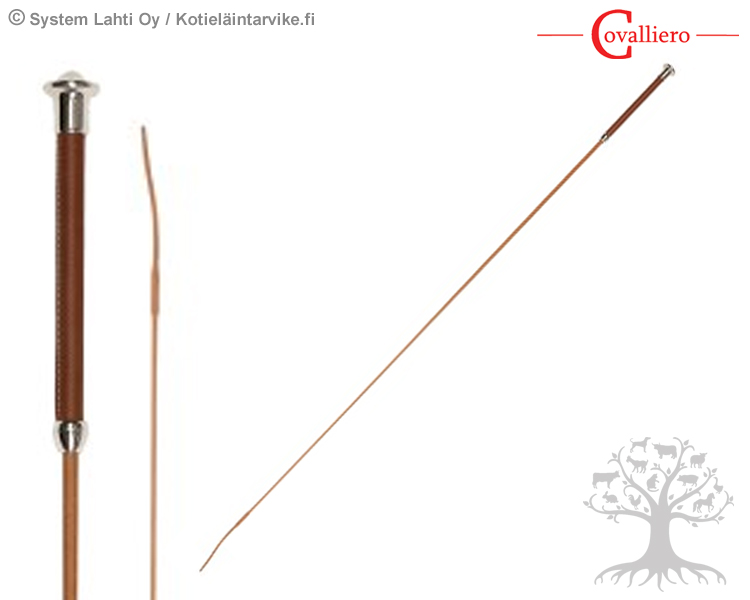 Covalliero Kouluraippa Dressage Cognac. Tyylikäs konjakinvärinen kouluraippa, jossa on pehmeä keinonahkainen kädensija. Raippa on valmistettu lasikuidusta, joka on päällystetty kestävällä nailonilla. Raipan kädensijan päässä on hopeanvärinen metallinen nuppi ja toisessa päässä "narusiima".