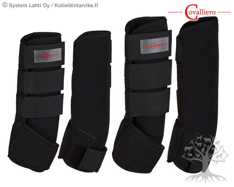 Covalliero Koulusuojasetti Fetlock. Laadukkaat, monikäyttöiset ja neopreenipintaiset koulusuojat kaikkiin jalkoihin. Suojien sisäpinta on vuorattu helppohoitoisella neopreenillä, reunoissa on kestävä ja joustava kanttinauha. Suojien sisä- ja ulkovuoren välissä on iskujavaimentava "shock-absorbing", hengittävä sekä pehmeä synteettinen kumikerros. Hyvin muotoillut ja istuvat suojat, jotka suojaavat myös vuohisalueen. Suojissa pitävät tarranauhat 4 kpl. Sisältää suojat kaikkiin jalkoihin, 2kpl eteen ja 2kpl taakse. Sopii hyvin myös tarhasuojiksi.