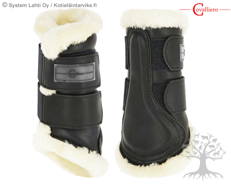 Covalliero Koulusuojat Pelisa Black. Laadukkaat ja tyylikkäät keinonahkapintaiset koulusuojat, jotka on vuorattu pehmoisella ja miellyttävän tuntuisella synteettisellä karvalla. Suojien sisäsyrjällä on vahvike, joka pehmentää hyvin iskuja. Anatomisesti muotoillut suojat istuvat hyvin hevosen jalkaan, ja niissä on koosta riippuen kaksi (pony, cob) tai kolme (full, x-full) pitävää ja joustavaa tarranauhakiinnitystä. Myydään pareittain.