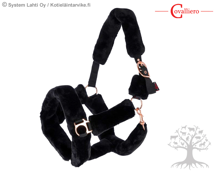 Covalliero Riimu SuperSoft Black. Laadukas ja superpehmeä karvapehmustettu nailonriimu, jossa hyvät säätömahdollisuudet niska- ja turpahihnassa. Riimu on valmistettu kulutusta kestävistä materiaaleista ja vahvoista saumoista. Riimussa on tyylikkäät ja kauttaaltaan ihanan pehmeät Faux -karvapehmusteet. Riimun kaikki soljet sekä pikalukko ovat kullanväriset.