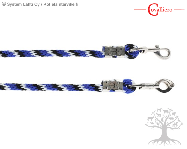 Covalliero Riimunnaru Mustang Blue / Black / White. Kudotusta, kestävästä polypropeenista valmistettu hieno kolmivärinen riimunnaru. Narun materiaali takaa hyvän pidon. Riimunnarussa on teräksen värinen lukko ja toisessa päässä on narun ulkonäön viimeistelevä muovinen musta tuppi. Riimunnarun pituus on noin 2m ja paksuus 14mm.
