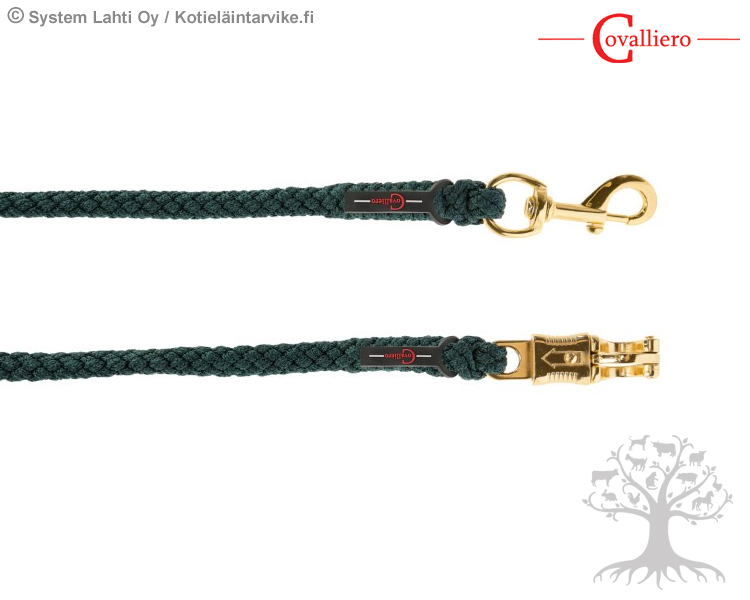 Covalliero Riimunnaru TopLine Forest. Miellyttävän tuntuinen ja pitävä riimunnaru, jossa on kullanvärinen lukko. Punottu riimunnaru on valmistettu helppohoitoisesta polypropeenistä. Riimunnarun pituus on 2m.