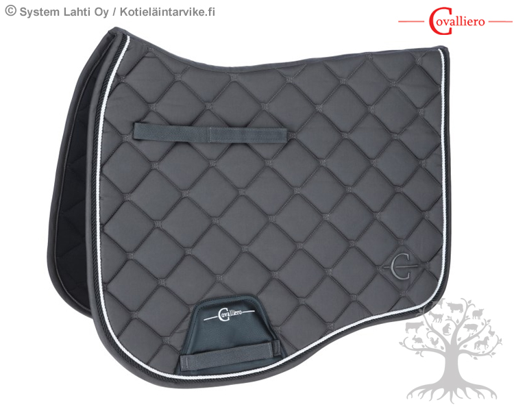 Covalliero Satulahuopa Salvina Graphite. Klassisen tyylikäs ja anatomisesti muotoiltu neliötikattu satulahuopa. Huovassa laadukas vaahtomuovitäyte paineen tasaamiseksi sekä lisäämään iskunvaimennusta. Sisäpinta nopeasti kuivuvaa ja hengittävää teknistä materiaalia. Tyylikkään ulkonäkön tuovat kauniit musta sekä valkoinen koristenyöri. Huovan molemmin puolin brodeerattu Covalliero-logo. Käyttömukavuutta lisäävät helpot ja kätevät tarralliset kiinnitysnauhat satulaa ja satulavyötä varten. Satulavyön kohdalla keinonahkavahvike. Konepestävä 30°C.