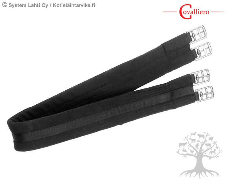 Covalliero Satulavyö Cotton. Puuvillakankaasta valmistettu pehmustettu satulavyö. Satulavyössä on vahvike, joten se kestää erittäin hyvin käyttöä ja kulutusta. Helppo pitää puhtaana, pestävä. Vyössä on rollersoljet, joustoton. Kaikki soljet ovat teräksen värisiä.