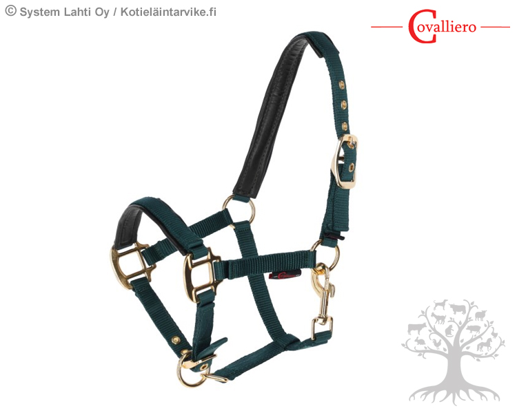 Covalliero Varsariimu TopLine Forest. Erittäin laadukas, kestävä ja säädettävä nailonriimu, jossa hyvät säätömahdollisuudet niska- ja turpahihnassa. Kolminkertainen poski- ja niskahihna, nailonhihnojen leveys 20mm. Tyylikkäässä varsariimussa on turvalla sekä niskassa keinonahkaiset pehmusteet. Riimun kaikki soljet ja pikalukko ovat kullanväriset. Riimu sopii hevosvarsoille ja pienille poneille (minishettis).