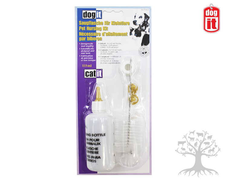 Dogit Lemmikin Tuttipullo -setti. Erittäin laadukas lemmikkien tuttipullo, joka soveltuu kaikille lemmikeille kuten koiran ja kissan pennuille, marsuille, kaneille, hamstereille, rotille, chincilloille ja muille syöttöhoitoa tarvitseville pieneläimille. Tuttipullosetti sisältää tuttipullon 115ml, kolme tuttia, pulloharjan ja kaksi tuttikorkkia. Tuteissa ei ole valmiiksi reikää, joten sopivan kokoisen reiän voi tehdä tuttiin oman tarpeen mukaan. Tee tutin päähän puhdistetulla neulalla pieni reikä, terävällä veitsellä ristiviillot tai leikkaa saksilla suurempi reikä tarpeen mukaan. Älä tee liian suurta reikää, ettei eläin pääse nielemään likaa juotettavaa nestettä tai ilmaa. Puhdista pullo ja suuttimet aina käytön jälkeen saippualla ja lämpimällä vedellä (ei yli 60C). Tuttipullosetti myrkytön, joten se on turvallinen käyttää. Tuttipullo on pääasiassa tarkoitettu maidon juottoon.