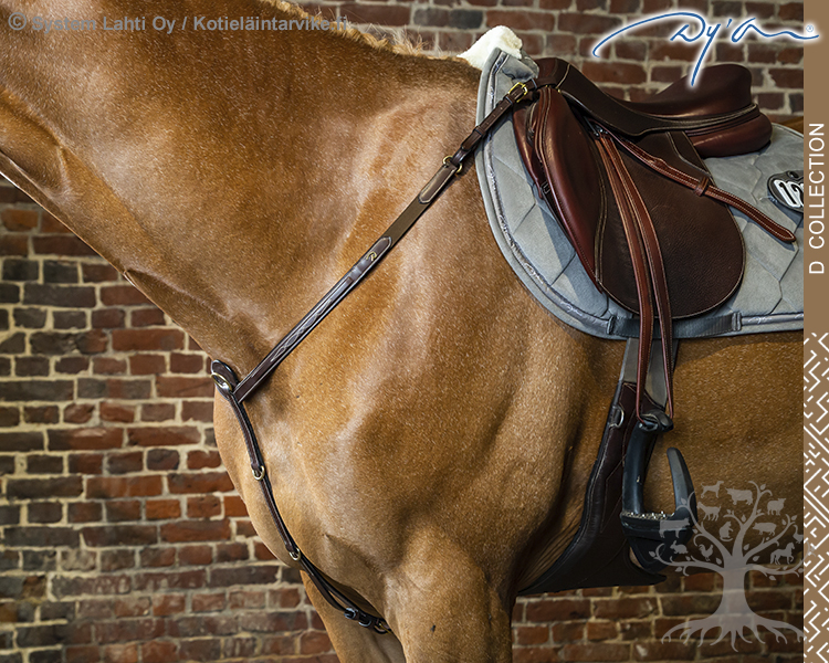 Dyon D Collection Rintaremmi Flash. Dyonin erittäin korkealaatuinen ja klassisen tyylikäs rintaremmi, jossa on hienot kantikkaat ”kohokanttaukset”, Flash -koristeompeleet, kermanväriset tikkaukset ja messinkisoljet. D Collection on valmistettu erittäin hienosta ja pehmeästä Dy’on -nahasta. Rintaremmissä on paljon säätövaraa ja 6cm joustot molemmin puolin. Rintaremmi kiinnitetään pikalukoilla satulan D-renkaisiin ja solkikiinnityksellä satulavyöhön. Rintaremmissä on D-rengas martingaaliosaa ja kaksi lisärengasta sivu-/apuohjia varten. Ei sisällä martingaaliosaa.
