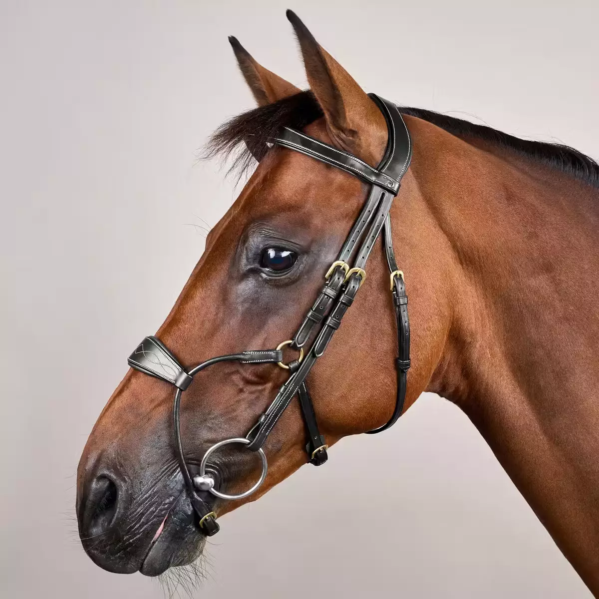 Dyon D Collection Suitset Hybrid Noseband. Dyonin erittäin korkealaatuiset ja klassisen kauniit suitset, joissa on kermanväriset tikkaukset ja messinkisoljet.