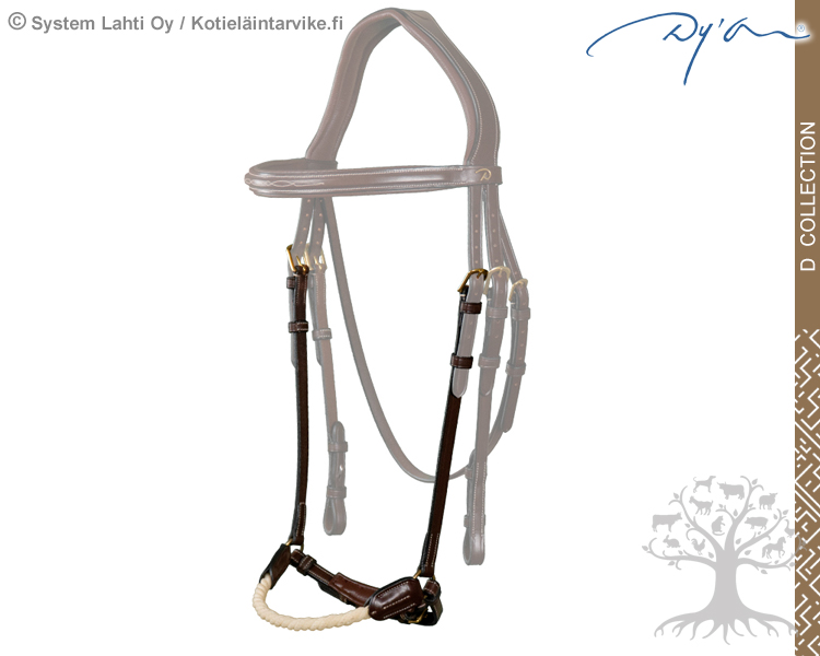 Dyon D Collection Turpahihna Rope Drop. Dyonin erittäin korkealaatuinen ja klassisen kaunis Rope -remonttiturpahihna, jossa on kermanväriset tikkaukset ja messinkisoljet. D Collection on valmistettu erittäin hienosta ja pehmeästä Dy’on -nahasta. Luonnonvalkoinen Rope -naruturpahihna on vahattua ja jäykähköä köysinarua. Rope -remonttiturpahihna on vaikutukseltaan hieman voimakkaampi kuin perinteinen remonttiturpahihna. Rope -turpahihna kiinnitetään melko "löysästi" niin, että nenäluun ja turpahihnan väliin mahtuu vähintään kaksi sormea.Sopii kaikkiin Dyon D Collection suitsimalleihin.