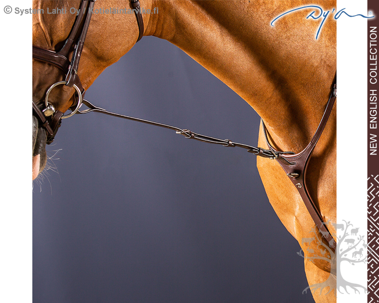 Dyon New English Collection Martingaaliosa Standing. Dyonin erittäin laadukas kiinteä martingaaliosa, jossa on nahanväriset tikkaukset ja ruostumattomat terässoljet. New English Collection on valmistettu erittäin hienosta ja pehmeästä Dy’on -nahasta. Kiinteässä martingaaliosassa on paljon säätövaraa, joten se on helppo säätää juuri sopivan pituiseksi. Kiinteä martingaaliosa kiinnitetään rintaremmin/martingaalin D-renkaaseen ja suitsen turparemmiin (katso kuva). Ei sisällä varsinaista martingaalin kaulaosaa.