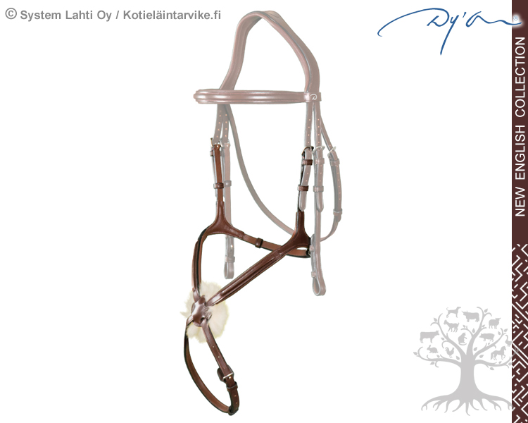Dyon New English Collection Turpahihna Figure 8. Dyonin erittäin korkealaatuinen ja klassisen kaunis meksikolainen turpahihna, jossa on hieno kantikas ”kohokanttaus”, nahanväriset tikkaukset ja ruostumattomat terässoljet. New English Collection on valmistettu erittäin hienosta ja pehmeästä Dy’on -nahasta. Turpahihnassa on lampaankarvapehmuste, tyylikkäät Flash -koristeompeleet ja kaunis anatominen muotoilu ilman perinteisiä O-renkaita. Sopii kaikkiin Dyon New English Collection suitsimalleihin.