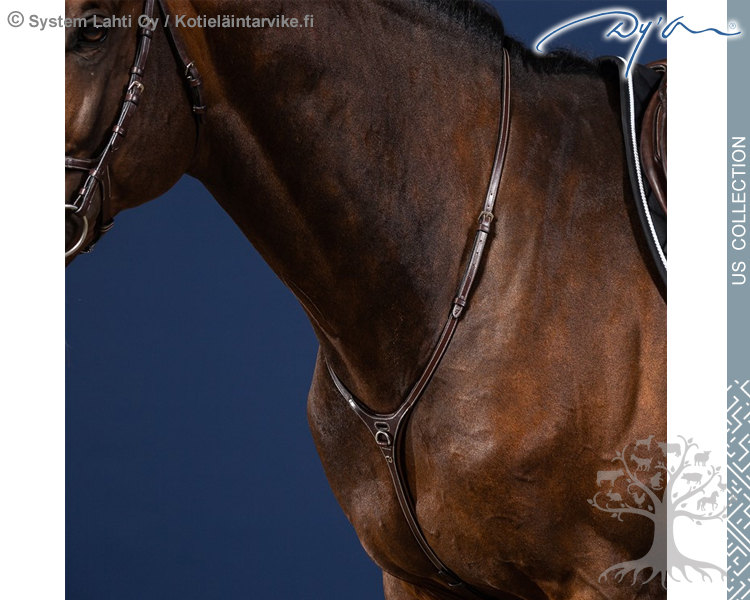Dyon US Collection Martingaalin Kaulaosa Yoke. Dyonin erittäin korkealaatuinen ja klassisen tyylikäs martingaali, jossa on kermanväriset tikkaukset ja ruostumattomat terässoljet. US Collection on valmistettu erittäin hienosta ja pehmeästä Dy’on -nahasta. Martingaalissa on paljon säätövaraa, joten se on helppo säätää juuri sopivan kokoiseksi. Martingaalissa on kaksi kiinnityskohtaa martingaaliosaa varten. Ei sisällä martingaaliosaa.