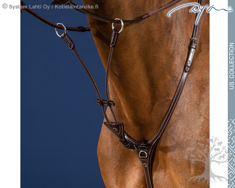 Dyon US Collection Martingaaliosa Elastic. Dyonin erittäin laadukas joustava martingaaliosa, jossa on kermanväriset tikkaukset, ruostumattomat terässoljet ja O-renkaat. US Collection on valmistettu erittäin hienosta ja pehmeästä Dy’on -nahasta. Elastisten martingaalihihnojen (halkaisija 8mm) välissä on nahkastoppari, joka pitää joustovat/elastiset hihnat erillään toisistaan. Nahkastopparin avulla joustohihnojen liikkuvuutta voidaan myös rajoittaa/stabiloida. Martingaaliosa kiinnitetään soljella rintaremmiin/martingaaliin ja O-renkaista ohjiin (katso kuva). Ei sisällä varsinaista martingaalin kaulaosaa. Joustava martingaaliosa sopii erityisesti herkille ja nuorille hevosille.