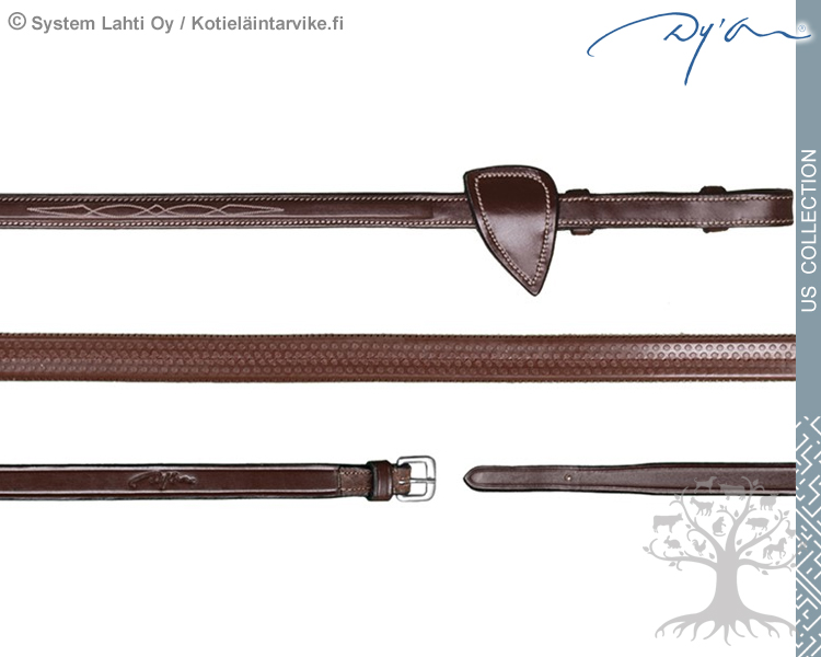 Dyon US Collection Ohjat Rubber 1/2" (13mm). Dyonin erittäin korkealaatuiset kumiohjat, joissa on hienot kantikkaat ”kohokanttaukset”, kermanväriset tikkaukset ja ruostumattomat terässoljet. US Collection on valmistettu erittäin hienosta ja pehmeästä Dy’on -nahasta. Ohjien kumiosan sisällä on nylonvahvike, joka tekee ohjista hyvin kestävät. Kumiohjien kuminystyrät auttavat saamaan pitävän otteen. Ohjien leveys 1/2", 13mm. Ohjissa on tyylikkäät D -malliset martingaalistopparit ja tyylikkäät Flash -koristeompeleet. Ohjien piilosoljet tekevät suitsista huolitellun näköiset. Sopii kaikkiin Dyon US Collection suitsimalleihin.