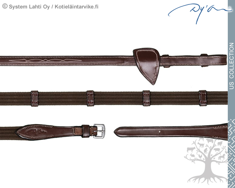 Dyon US Collection Ohjat Webs 5/8" with 9 Leather Loops. Dyonin erittäin korkealaatuiset kangasohjat, joissa on hienot kantikkaat ”kohokanttaukset”, kermanväriset tikkaukset ja ruostumattomat terässoljet. US Collection on valmistettu erittäin hienosta ja pehmeästä Dy’on -nahasta. Kangasohjassa on nahkastopparit (9 leather loops), jotka auttavat saamaan pitävän otteen. Ohjien leveys 5/8", 16mm. Ohjissa on tyylikkäät D -malliset martingaalistopparit ja tyylikkäät Flash -koristeompeleet. Ohjien piilosoljet tekevät suitsista huolitellun näköiset. Sopii kaikkiin Dyon US Collection suitsimalleihin.