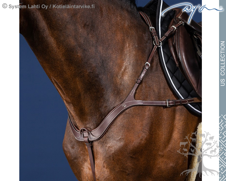 Dyon US Collection Rintaremmi Anatomical. Dyonin erittäin korkealaatuinen ja klassisen tyylikäs 5-pisteen rintaremmi, jossa on kermanväriset tikkaukset ja ruostumattomat terässoljet. US Collection on valmistettu erittäin hienosta ja pehmeästä Dy’on -nahasta. Anatomisesti muotoilussa rintaremmissä on 5-pisteenkiinnitys; solkikiinnitys satulavyöhön (alapuolelta ja molemmilta sivuilta) sekä pikalukkokiinnitykset satulan D-renkaisiin. Voidaan käyttää myös ilman alapuolista satulavyön kiinnitystä (4-pistekiinnitys). Rintaremmissä on paljon säätövaraa ja 6cm joustot molemmin puolin sekä säädettävä kaulan yli menevä siltahihna (bridge). Rintaremmi on muotoiltu niin, että se tarjoaa hevoselle maksimaalisen liikkumavapauden. Rintaremmissä on hieno nahkainen kiinnityslenkki martingaaliosaa varten. Ei sisällä martingaaliosaa.