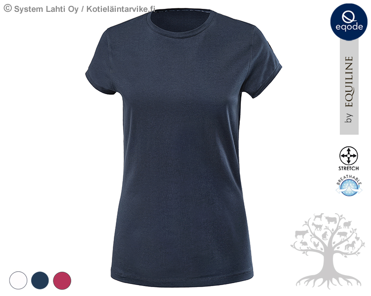 Eqode by Equiline Naisten T-Paita Team. Eqode by Equiline -malliston tyylikkään ajaton naisten pyöreäpäänteinen T-paita, jossa on Equilinen -tyyliin hyvin selkää suojaava pidempi helma, ajaton leikkaus sekä 4 -suuntaan joustava ja hyvin hengittävä kangas. Paidan hihassa on hieno Eqode -malliston Q -logomerkki. Hyvin istuva ja erittäin mukavantuntuinen T-paita, joka soveltuu aktiivisempaankin hevosurheiluun. Suosittelemme!