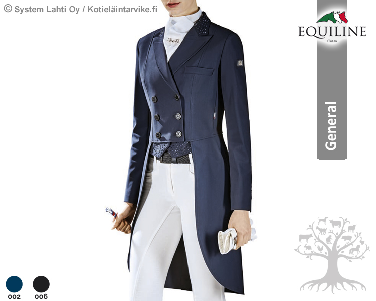 Equiline General Naisten Kisafrakki Marilyn. Equilinen huippulaadukas, tyylikäs ja elegantti naisten kisafrakki, joka on huippuunsa suunniteltu ja valmistettu urheiluvaate. Kisafrakin tekniset ominaisuudet tulevat esiin erityisesti frakin leikkauksissa, muodoissa, materiaaleissa ja ennen kaikkea korkeassa laadussa.