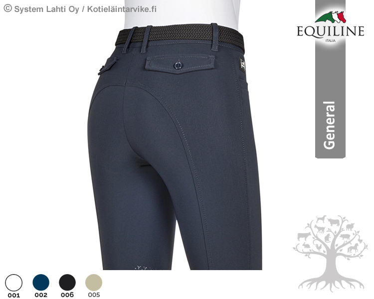 Equiline General Naisten Ratsastushousut B-Move Bonded Knee Grip Atirk. Equilinen huippulaadukkaat, erittäin tyylikkäät, polvigrip-paikkaiset ja B-Move -kankaiset naisten ratsastushousut, jotka on huippuunsa suunniteltu ja valmistettu urheiluvaate. Ratsastushousujen tekniset ominaisuudet tulevat esiin erityisesti housun leikkauksissa, muodoissa, materiaaleissa ja ennen kaikkea korkeassa laadussa. Housut on valmistettu laadukkaasta, joustavasti ja hieman paksummasta 340gm2 B-Move Bonded -kankaasta. Ratsastushousujen Knee X-Grip -polvipaikat on optimaalisen pitävää (ei liian pitävää) ja laadukasta silikonia. Housuissa on etutaskut ja takana napilliset valetaskut. Lahkeensuissa on pehmeät joustoresorit. Puolikorkea vyötärön korkeus.