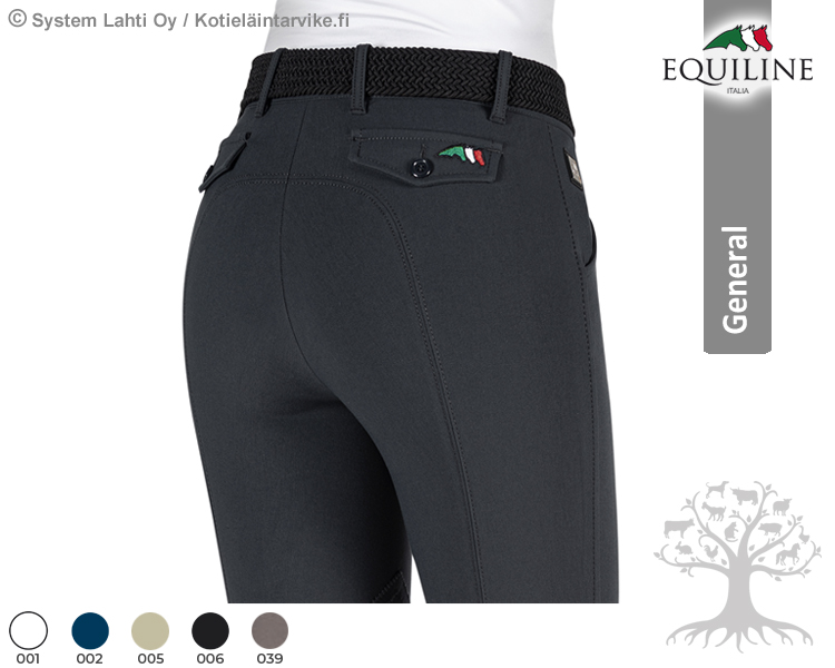 Equiline General Naisten Ratsastushousut E-Plus Superior Knee Patch Boston. Equilinen huippulaadukkaat ja erittäin tyylikkäät naisten polvikangas -paikkaiset ratsastushousut, jotka on huippuunsa suunniteltu ja valmistettu urheiluvaate. Ratsastushousujen tekniset ominaisuudet tulevat esiin erityisesti housun leikkauksissa, muodoissa, materiaaleissa ja ennen kaikkea korkeassa laadussa. Housut on valmistettu erittäin laadukkaasta ja hyvin tukea antavasta E-Plus Superior -kankaasta. Housuissa on etutaskut ja takana napilliset valetaskut. Lahkeensuissa on pehmeät joustoresorit. Puolikorkea vyötärön korkeus.