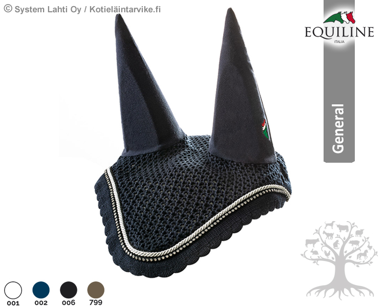 Equiline Korvahuppu Rio. Equilinen erittäin laadukas ja tyylikäs korvahuppu, joka on valmistettu antibakteerisesta ja allergisoimattomasta puuvillasta ja akryylistä. Rio -korvahupussa on hieno hopeanvärinen koristenyöri ja erittäin kauniista kimalteleva Rhinestones -kristallinauha (Rhinestones -kristallit on aitoa hiottua kalilasia). Korvahuppu suojaa hevosen korvia hyönteisiltä ja eristää hieman melua ja ääniä, joten se auttaa hevosta keskittymään paremmin itse suoritukseen ja tehtäviin. Korvahupun korvaosat on erittäin pehmeää ja joustavaa kangasta, vasemman puoleisessa korvaosassa on brodeerattu Equiline -logo. Saatavana vain Full -kokoisena.