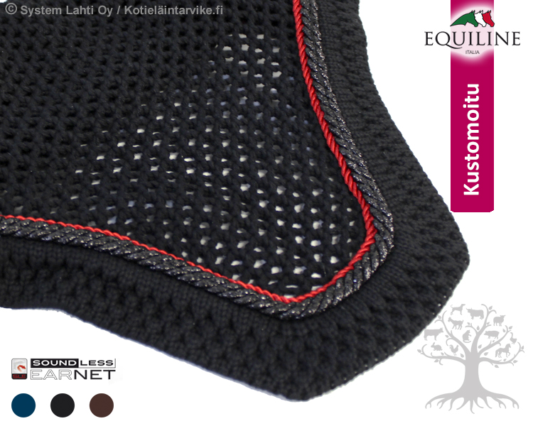 Equiline Korvahuppu Soundless Dave Piping 112+352. Equilinen erittäin laadukas, tyylikäs ja ainutlaatuisen tehokkaasti ääntäeristävä sekä kantikkaasti "Rectangural Desing" -muotoiltu valmiiksi kustomoitu korvahuppu, joka on valmistettu antibakteerisesta ja allergisoimattomasta puuvillasta ja akryylistä. Ääntäeristävät "korvaosat" on valmistettu kolmesta eri kerroksesta: sisä- ja ulkopinnat on puuvillaa ja niiden välinen sisäkerros ääntäeristävää teknistä materiaalia. Erittäin korkealaatuinen korvahuppu, joka suojaa hyönteisiltä ja eristää erittäin tehokkaasti melua ja ääniä, joten se auttaa hevosta keskittymään paremmin itse kilpailusuoritukseen ja tehtäviin. Korvahupun korvaosat on erittäin pehmeää ja joustavaa kangasta, vasemman puoleisessa korvaosassa on brodeerattu Equiline -logo.