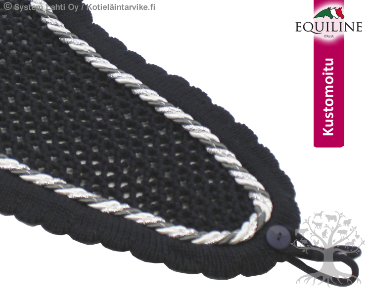 Equiline Korvahuppu Soundless Ruben Piping 94. Equilinen erittäin laadukas, tyylikäs ja ainutlaatuisen tehokkaasti ääntäeristävä pitkänmallinen valmiiksi kustomoitu korvahuppu, joka on valmistettu antibakteerisesta ja allergisoimattomasta puuvillasta ja akryylistä. Ääntäeristävät "korvaosat" on valmistettu kolmesta eri kerroksesta: sisä- ja ulkopinnat on puuvillaa ja niiden välinen sisäkerros ääntäeristävää teknistä materiaalia. Pitkässä korvahupussa on kiinnitysnaru ja nappi turparemmiin kiinnitystä varten, joten korvahuppu pysyy hyvin paikoillaan. Erittäin korkealaatuinen korvahuppu, joka suojaa hyönteisiltä ja eristää erittäin tehokkaasti melua ja ääniä, joten se auttaa hevosta keskittymään paremmin itse kilpailusuoritukseen ja tehtäviin. Korvahupun korvaosat on erittäin pehmeää ja joustavaa kangasta, vasemman puoleisessa korvaosassa on brodeerattu Equiline -logo.