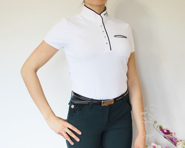 Equiline Limited Naisten Kisapaita Clara. Equilinen huippulaadukas, nuorekas ja ihanan pehmeä tekninen naisten lyhythihainen kisapaita, joka on huippuunsa suunniteltu ja valmistettu urheiluvaate. Paidan tekniset ominaisuudet tulevat esiin erityisesti paidan leikkauksissa, muodoissa, materiaaleissa ja ennen kaikkea korkeassa laadussa. Kisapaita on valmistettu erittäin joustavasta ja hengittävästä kankaasta, joka antaa erinomaisen liikkumavapauden. Paidan kangas on erittäin pehmeää ja kevyttä joustokangasta. Kauluksessa ja selkäpuolella tyylikäs tummansininen brodeerattu /painettu kirjonta ja Equiline -tekstilogo. Paidan kauluksen, napituksen ja etutaskun reunassa kontrastia antava tummansininen kanttinauha.