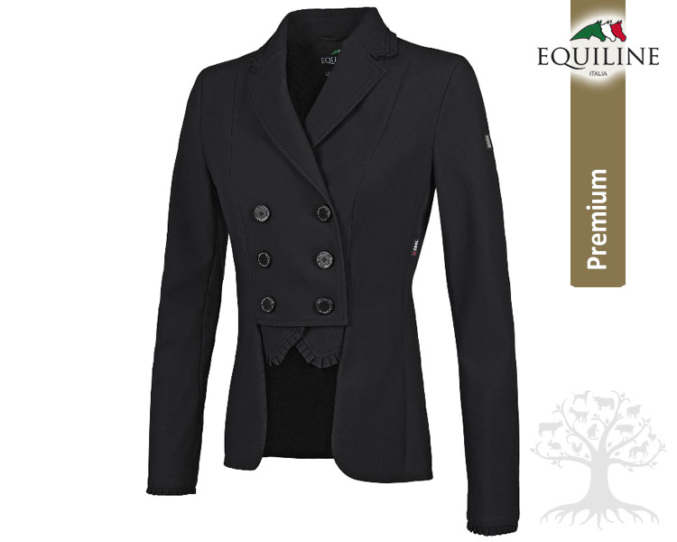 Equiline Limited Naisten Kisatakki Avila. Equilinen huippulaadukas ja elegantti tekninen naisten kisatakki, joka on huippuunsa suunniteltu ja valmistettu urheiluvaate. Erittäin kaunis ja tyylikäs frakki-mallinen kisatakki, jossa on kisafrakin kaulus, napitus ja etuhelma sekä hihat. Takin tekniset ominaisuudet tulevat esiin erityisesti takin leikkauksissa, muodoissa, materiaaleissa ja ennen kaikkea erittäin korkeassa laadussa. Kisatakki on valmistettu erittäin hengittävästä ja vettä sekä likaa hylkivästä X-COOL EVO-kankaasta, joka on erittäin joustavaa, kevyttä, miellyttävän tuntuista sekä ergonominen antaen erinomaisen liikkumavapauden. Helppo hoitoinen ja nopeasti kuivuva. Takin etuhelmassa, kauluksissa ja hihoissa on erityisen kauniit ja tyylikkäät vekki rypytykset ja koristestrassein koristellut napit. Kauluksessa mustilla koristestrasseilla koristeltu hieno Eguiline-logo. Kisatakki on suunniteltu ja valmistettu Italiassa. Elegantti ja klassisen kaunis lyhyt helmainen kisafrakki vaativaan makuun!