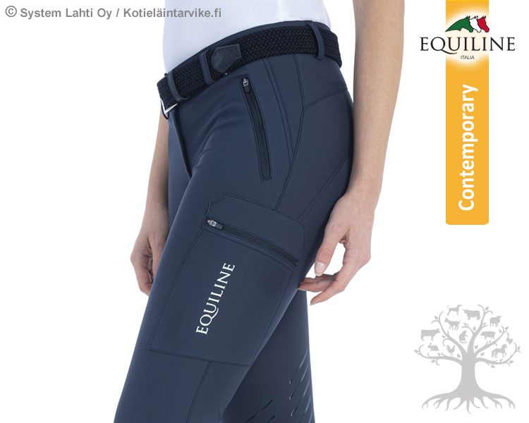 Equiline Limited Naisten Ratsastushousut B-Move Bonded Knee Grip Chantalc. Supermukavat, joustavat, pehmeät ja laadukkaat Equiline Team Collection #riders team -malliston polvigrip -paikkaiset naisten ratsastushousut, jotka on huippuunsa suunniteltu ja valmistettu urheiluvaate. Ratsastushousun tekniset ominaisuudet tulevat esiin erityisesti housun leikkauksissa, muodoissa, materiaaleissa ja ennen kaikkea korkeassa laadussa. Ratsastushousujen Knee Grip -polvipaikat on optimaalisen pitävää ja laadukasta silikonia. Housut on valmistettu laadukkaasta, joustavasti ja hieman paksummasta 340gm2 B-Move Bonded -kankaasta. Lahkeensuissa on pehmeät lycra-resorit. Vyötärön korkeus on normaali. Housujen etutaskuissa on vetoketjut ja molemmissa ulkoreidissä on vetoketjulliset kännykkätaskut.