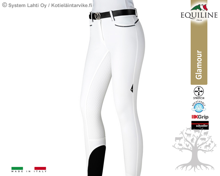 Equiline Limited Naisten Ratsastushousut Schoeller Full Grip Galaxyg. Equilinen huippulaadukkaat ja tyylikkäät kokogrip-paikkaiset naisten ratsastushousut, jotka on huippuunsa suunniteltu ja valmistettu urheiluvaate. Ratsastushousun tekniset ominaisuudet tulevat esiin erityisesti housun leikkauksissa, muodoissa, materiaaleissa ja ennen kaikkea korkeassa laadussa. Housut on valmistettu erittäin laadukkaasta ja hyvin tukea antavasta Schoeller Prestige -kankaasta. Ratsastushousujen Full X-Grip -kokopaikat ovat optimaalisen pitävää (ei liian pitävää) ja laadukasta silikonia.