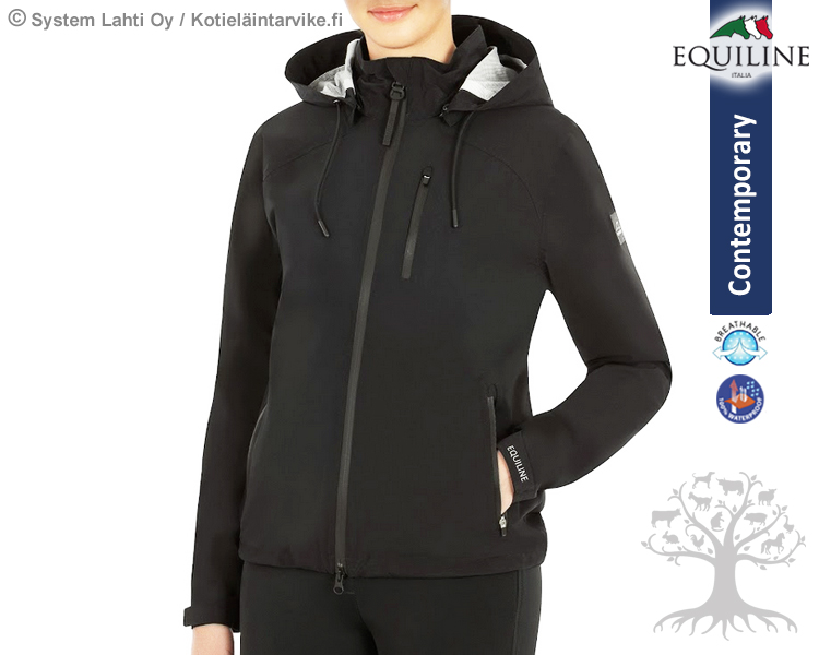 Equiline Limited Naisten Sadetakki Catec. Equilinen erittäin laadukas, tyylikäs ja hyvin istuva naisten tekninen vedenpitävä takki. Takissa on käytetty Equilinen innovatiivista W-EVO -tekstiiliä, joka tekee takista veden- ja tuulenpitävän sekä hyvin hengittävän ja joustavan. Takin selkäpuolella verkkokankaiset vedenpitävällä läpällä suojatut ilmanottoaukot. Edessä kaksisuuntainen vetoketju ja korkea lämmitettävä kaulus. Takissa on vedenpitävät "teipatut" vetoketjut/saumat, kaksi vetoketjullista taskua, vetoketjullinen rintatasku, sekä vetoketjulla irrotettava säädettävä huppu. Takin helmassa kiristysnyöri sekä hihansuissa tarranauhakiinnitys. Tyylikkäänä yksityiskohtana takissa on Equiline -Logo vasemmassa hihassa. Valmistettu ympäristöystävällisistä materiaaleista - Ride into Green!