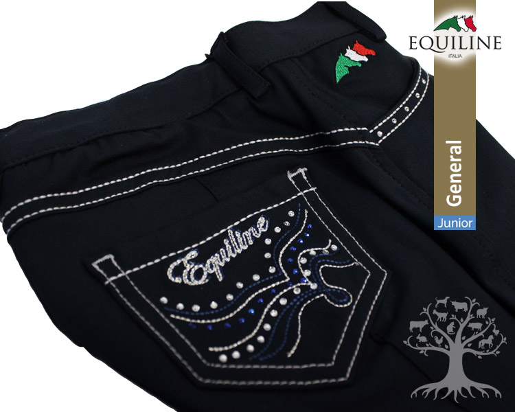 Ratsastushousujen Knee X-Grip -polvipaikat on optimaalisen pitävää (ei liian pitävää) ja laadukasta silikonia. Housuissa on hienot koristestrassit, tyylikäs Equiline-brodeeraus sekä kauniit koristetikkaukset. Housuissa on etu- ja takataskut. Lisäksi vyötärön sisäpuolella on säädettävä vyötärön kiristysnauha, joka pitää housun hyvin paikoillaan. Lahkeensuissa on pehmeät joustoresorit. Vyötärön korkeus on normaali.