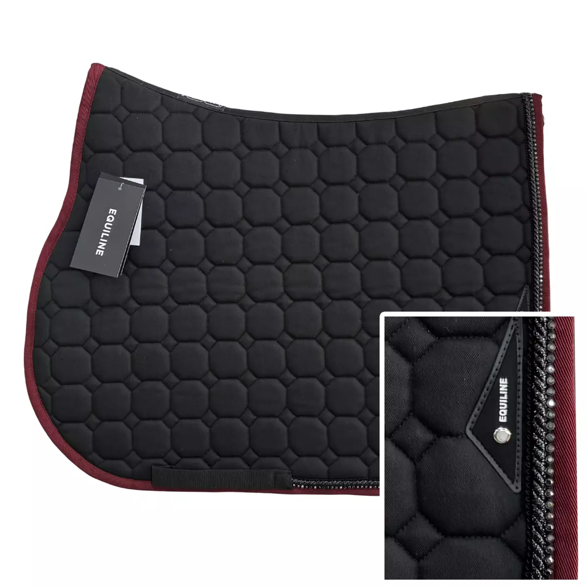 Equiline Satulahuopa Octagon Piping B3+S066+112. Equilinen erittäin korkealaatuisen ja valmiiksi kustomoidun Octagon -satulahuovan sisällä on paksu, tiivis ja hengittävä 900g -täyte, joka pitää huovan ryhdikkäänä ja jämäkästi paikoillaan.